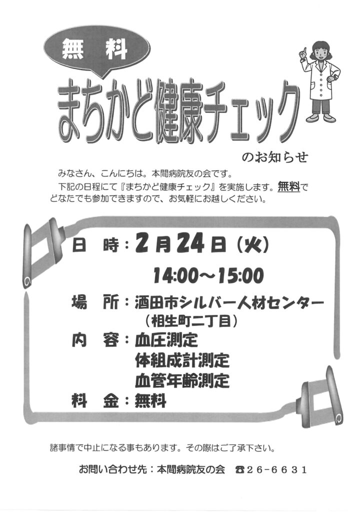 2026年1月14日 / 最終更新日 : 2026年1月14日 sakata_sc お知らせ 【まちかど健康チェック】 酒田市シルバー人材センターを会場に本間病院友の会様より健康チェックを実施していただきます。 無料ですのでお気軽にお越しください。 詳細は画像をご覧ください。